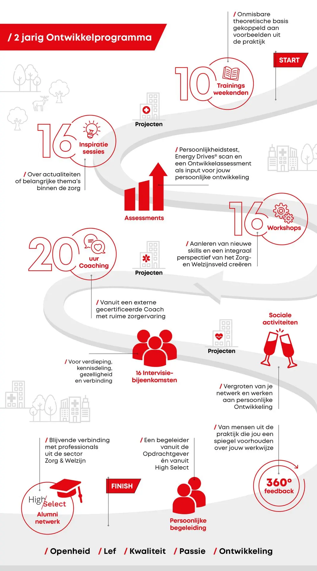 Het Traineeship Zorg & Welzijn van High Select is een tweejarige investering in jezelf en bestaat uit twee onderdelen. Enerzijds ga jij, als volwaardig lid van de organisatie, projecten doen bij verschillende organisaties binnen de sector zorg & welzijn. Anderzijds volg je een uitgebreid ontwikkelprogramma, wat gericht is op jouw persoonlijke en professionele Ontwikkeling. Hiermee heb jij aan het einde van jouw Traineeship de juiste handvatten om jouw carrière een succesvol vervolg te geven.